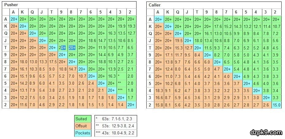 下面的例子展示的是两名玩家之间的扑克游戏版本,其中唯一的选择是全下/跟或弃牌。这些数字是全下或跟注获利的最大大盲注数。例如,所有口袋对子都可以以20个BB获利,而大多数口袋对子可以以相同的额度跟注。7-2非同花只有在你记分牌降到1.6个BB或更少时才可以全下,并且只有在您的记分牌降至2.6BB时才能跟注。