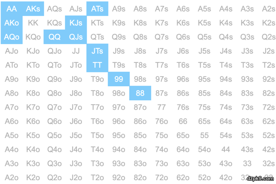 之所以选择这样的起手牌来做挤压打法,有两个原因。第一,所有Ax和同花broadway牌包含了可以防止对手跟注你或者4-bet你的阻断牌。当你用AT同花这样的牌做挤压打法的时候,对手不太可能用AA、AK、AQ或者TT来回击你。