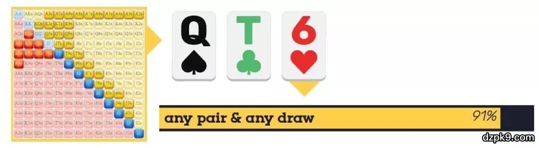 你需要读牌技能去给对手的翻前行动指定一个范围。然后你拿那个范围和翻牌比较。仔细考虑他总是/经常/从不跟注你持续下注的牌型。有些牌手对抗持续下注将用任何对子和所有可能的听牌继续游戏,因此弃牌率相当低。另一些牌手则用中对或更好牌以及两端顺子听牌、同花听牌继续游戏。这种牌手弃牌频繁,因此在翻牌圈对他们诈唬非常合理。