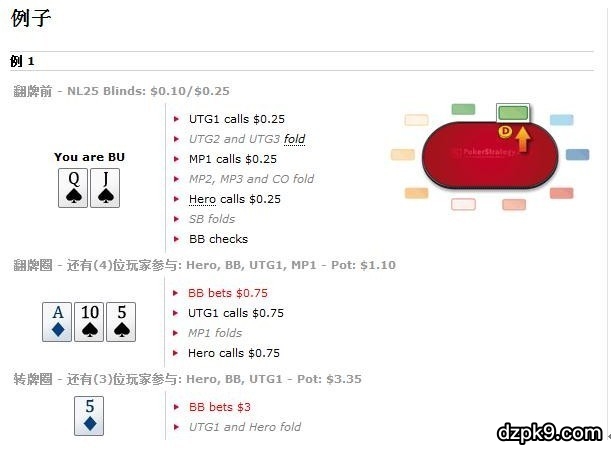 从翻牌圈开始计算. 你支付了$0.75进入翻牌圈, 底池有$1.10 + 2 * $0.75 = $2.60.?你的底池成败比 $2.60 : $0.75 大概是3.5:1.
