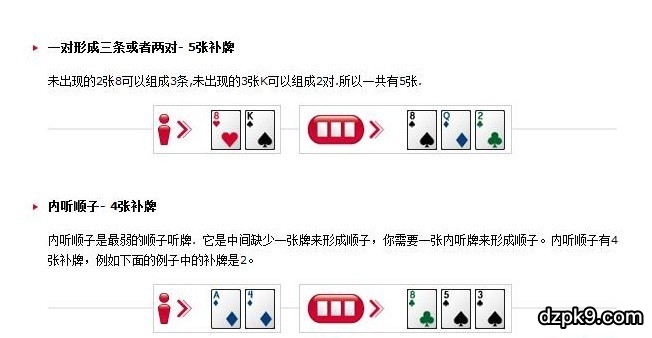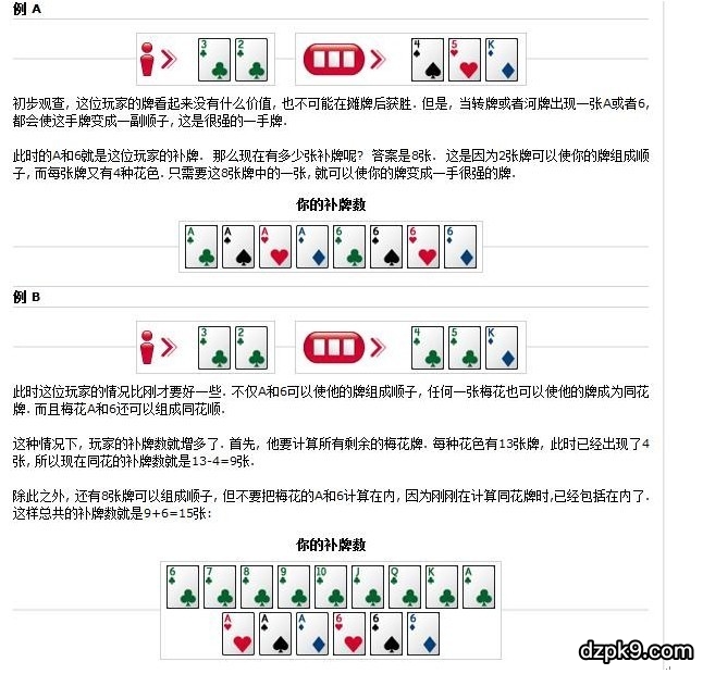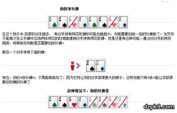 补牌数是所有在公共牌中出现能帮助你的牌的数量.有些补牌比另外一些补牌更有帮助;当你在玩一手听型牌的时候,你需要帮你组成最好的牌的补牌。这点我们在稍后讨论 .