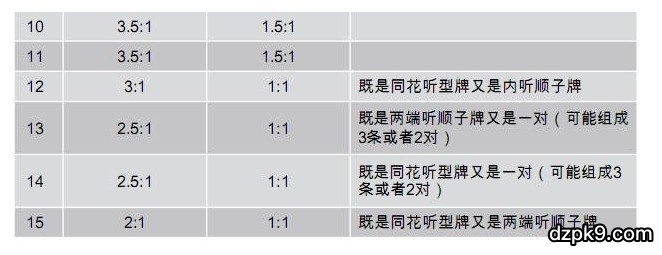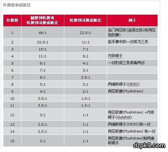 下表我们在小筹码策略中使用过,它告诉我们不同的听型牌在翻牌圈到转牌圈的时候的成败比