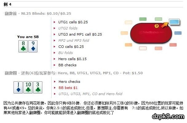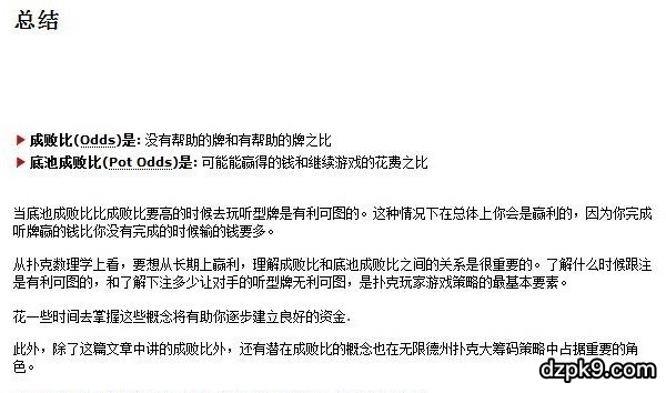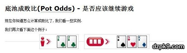 底池成败比比成败比要高, 继续游戏是有利可图的.如果底池成败比比成败比要低,从长期来看,你继续游戏是会输钱的。