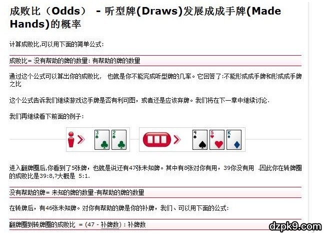 底池成败比是你可能能赢得的钱和你要继续游戏投入的资金之比.通过比较底池成败比和成败比你可以判断继续游戏听型牌是否有利可图。