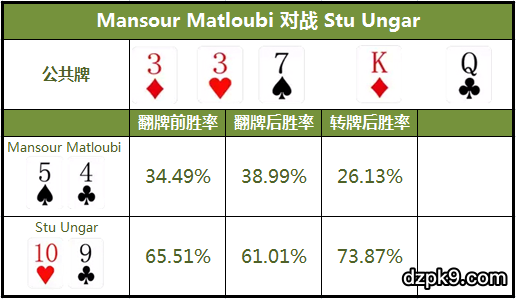 河牌发出Q♣,Matloubi all-in所有筹码,约32,000,Ungar选择跟注,并最终获胜!