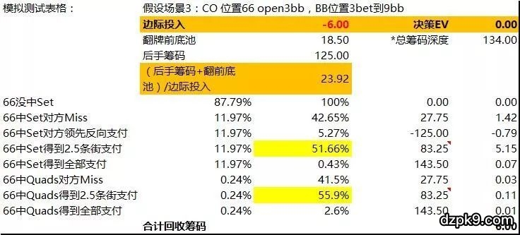 按照这个表格测算,如果150bb筹码深度,R值大约=27.1,当66中Set的时候,要能把对手的筹码打掉71bb(含翻前9bb投入),才能获得盈亏平衡。而如果66只能打掉对手50bb筹码,那么对于66的边际投入是6bb而言,平均要亏掉大约2bb。