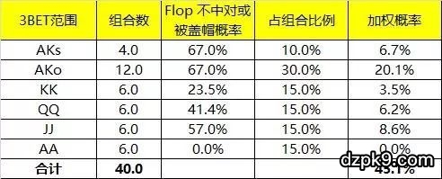(JJ+,AK)这样紧的一个3Bet范围,在不考虑对手底牌情况下,Flop没有中对或者对子被盖帽的平均概率是45.1%!