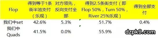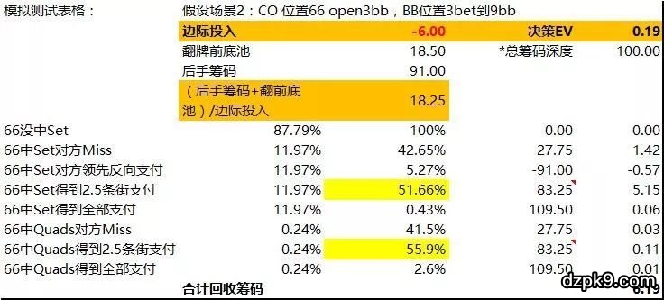 因此,粗略地说面对对手持有AA,我们小对子投机Set的时候,计算有效筹码量时,盈亏平衡的最小的筹码量水平为:(跟注后底池死钱+后手有效筹码)/边际跟注投入筹码≥10。