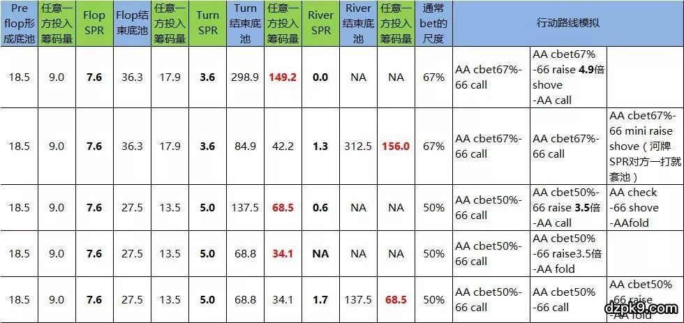 ● 如果AA的下注尺度一般都是50%底池(比如Pokerstars平台上的对手),那么基本上打掉对手68.5bb的筹码几乎是极限了——需要AA连续打三条街,或者66 Turn上raise一条街并且AA会call,但想要在这个筹码量之下让AA支付第四条街是很难的。