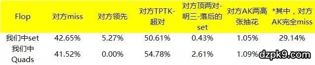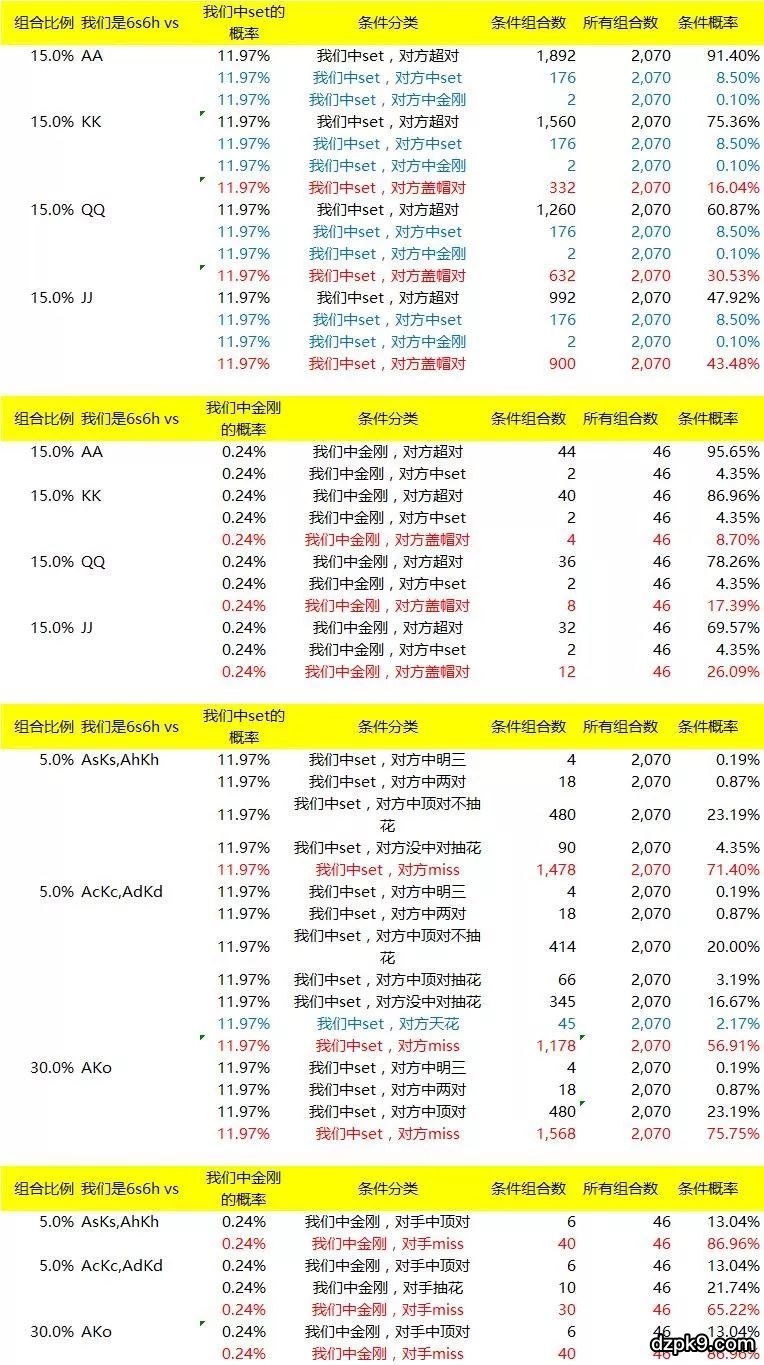 1、当6s6h中Set的时候,(JJ+AK)在Flop Miss掉以至于无法行动超过一条街的概率大约是42%!(注,这里Miss掉以至于无法行动超过一条街指AK没中对也没抽花,JJ-KK被盖帽)