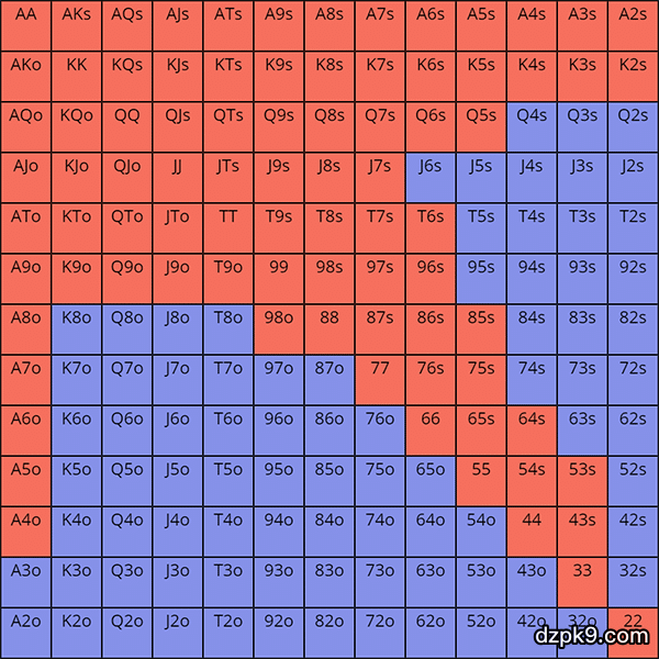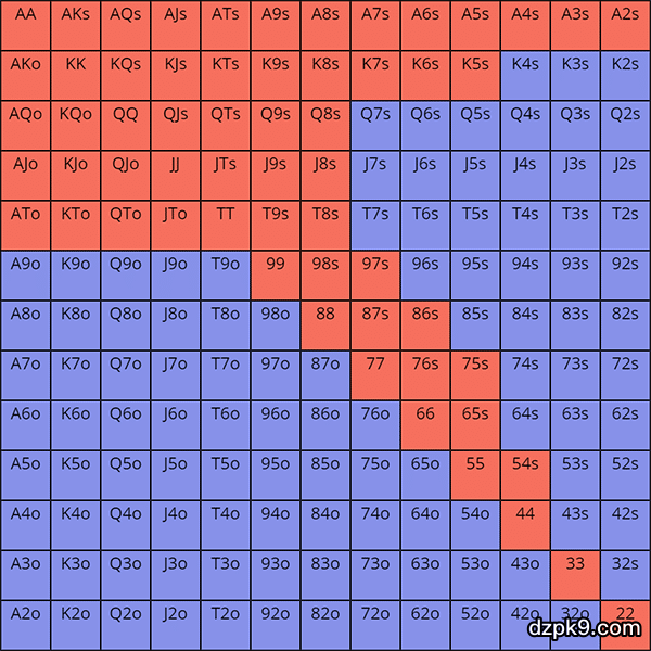 说明:一个40%起手牌的按钮位置率先加注范围。红色方格表示加注,蓝色方格表示弃牌。
