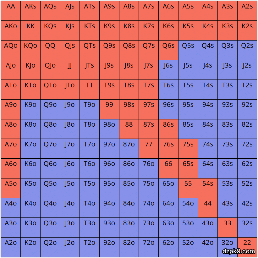 说明:一个26%起手牌的标准桌CO位置率先加注范围。红色方格表示加注,蓝色方格表示弃牌。