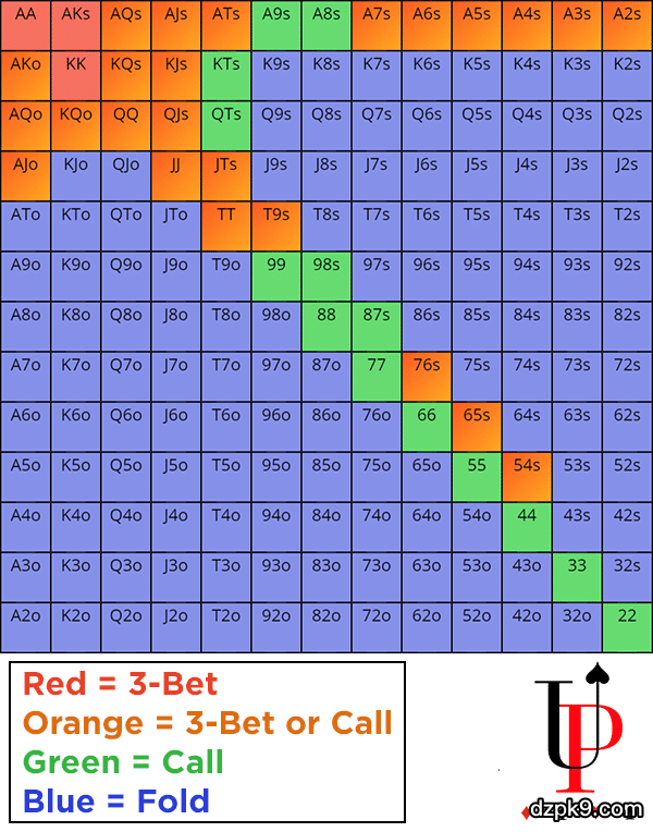 2、如果BTN位的玩家很狡猾,3-bet的频率很高,那你就该紧一些,用20%的牌型开局。