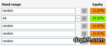 3、隔离对手。选择3-bet后,我们在翻后打多人底池的可能性就变低了,人少对我们是有好处的,因为底池每增加一个对手,你的赢率/权益都跟着变低,比方说拿了AA这手牌,当对手只有一位的时候,你的赢率大概可以到85%,可若是在一个多人底池中,AA的赢率就低了很多,随便输入四手牌,AA的赢率可能只剩约55%。