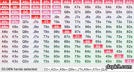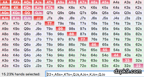 - 22+以上的口袋对 - A2s+- A8o+ - 两高张(即是小于A大于10的牌型组合) - 所有同花连牌 - 46o以上的隔张同花连牌 |