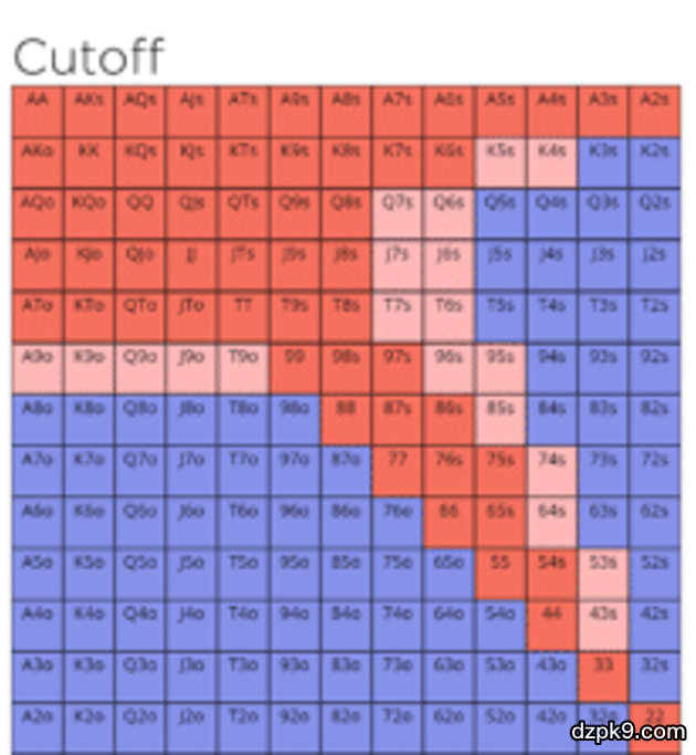 相比9-10人桌,我们在6人桌的开局范围会相对宽很多,如果是满人桌,我们建议大家用所有牌型中最强的那15%加注入局,这些牌型如下图↓↓↓
