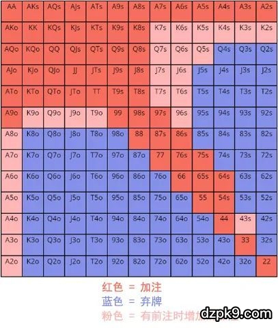 当前注生效时,我们几乎可以将率先加注范围扩大一倍,增加到约20%起手牌。我们现在用所有同花A高牌、所有口袋对子和一些同花连子、非同花大高张做率先加注