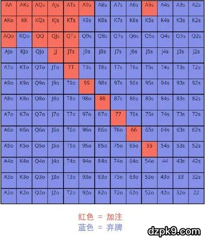 但是,有一种场合需要调整:当我们用一手小筹码游戏时。如果采用单人全额的投前注方式,我们可能需要根据筹码量放宽我们的全压范围。例如,如果我们有10BB筹码,而比赛采用大盲投前注方式,那么我们可能应该轮到大盲位置之前放宽我们的全压范围,避免在发到任何牌之前事先投入20%的筹码到底池中。
