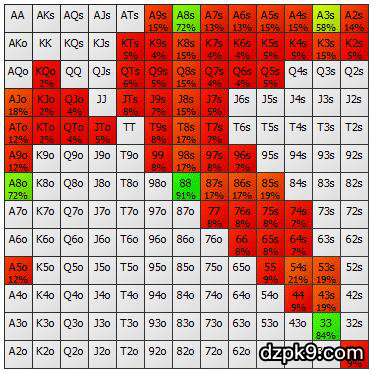 在无限德州扑克中,选择最优下注尺度是一项棘手的任务。扑克中没有任何能够适用于所有场合的“完美”下注尺度。理想的下注尺度通常取决于各种因素,其中包括:翻前行动、公共牌结构、筹码深度、谁具有范围优势。在本文中,你将学到八个帮助你在任何情况下选择一个理想下注尺度的一般法则。著名高注额牌手Doug Polk将在文中为我们分析一些牌例。缺乏经验的弱手喜欢用同样的范围(即静态跟注范围)跟注加注,不管你的加注尺度是多少。如果弱手会用与对抗2.5BB加注相同的范围跟注3.5BB加注,你应该选择加注到3.5BB,因为平均而言这使你赚到更多钱。当你在有利位置时,你应该3bet到大约对手加注额的3倍;当你在不利位置时,你应该3bet到大约对手加注额的4倍。当你在不利位置时,对手实现其底池权益将容易很多,这意味着你应该增加你的3bet尺度。与之相反,你在有利位置通常应该使用较小的3bet尺度,因为你想使拿着中等牌的对手陷入困境。除了获得价值,翻牌圈和转牌圈下注也在对手弃牌时拒绝了他们的底池权益。换句话说,你通过迫使他们对下注弃牌夺走了他们赢得底池的机会。当拒绝底池权益不太重要时,你有使用较小下注尺度的更多动机。在干燥公共牌面往往如此,因为大多数对手的牌对抗你的价值下注范围胜率很低。在干燥牌面使用较小下注尺度的另一个好处是,跟注范围往往是无弹性的。换句话说,无论下注尺度如何,对手对下注弃牌的可能性是相近的。当你可以用较小下注得到同样结果时,为什么冒险用你的诈唬牌下大注?此外,较小下注尺度非常适合作为一种对抗弃牌过频对手的剥削性调整,这在现场扑克和许多对手往往使用“不中即弃牌”翻后策略的网络环境中尤其正确。Online Cash 6-Handed. 100bb Effective Stacks.Hero is dealt 6♦5♦ in the CO.UTG folds. MP folds. Hero raises to 2.5bb. BTN folds. SB folds. BB calls.BB checks. Hero bets 1.8bb. BB folds.Doug的分析:在像A♦8♠3♣这样的干燥翻牌面,较小下注尺度(在本例中是1/3底池大小)更有意义。这是因为,我们的价值下注牌(88,33,A8s,A3s,AK,AQ等等)不太可能在转牌圈被翻盘,因此我们没有多少用较大下注拒绝对手底池权益的动机。在下面的胜率计算中我们可以看到大盲玩家对抗我们价值下注范围的胜率有多低:大盲玩家的范围只有11.32%胜率。下面的表格表明大盲玩家范围中每手牌对抗我们的价值下注范围(不包括我们的诈唬牌)有多少胜率:大盲玩家范围中绝大部分牌对我们价值下注牌的威胁极小。另外,大盲玩家的跟注范围在这种场合可能缺乏弹性。像QJo和65s这样的牌不管下注多少往往都会弃牌,因此这些牌在后续回合的可玩性很差。更不用说它们对抗我们的价值牌几乎毫无胜算。当你的价值下注范围容易被逆转时,你应该使用较大下注尺度。这种策略有三个明显好处:2. 较大下注在转牌或河牌有可能将你的强牌降格为抓诈牌之前榨取更多价值。例如,在T♥9♥5♠4♠公共牌面几乎一半的出牌对你的9♣9♦不利。3. 较大下注尺度可产生更多弃牌赢率,使你的诈唬更高效。Online Cash 6-Handed. 100bb Effective Stacks.Hero is dealt A♣A♥ on the BTN.UTG raises to 3bb. MP calls. CO folds. Hero raises to 11bb. SB folds. BB folds. UTG calls. MP calls.UTG checks. MP checks. Hero bets 12bb. UTG calls. MP calls.UTG checks. MP checks. Hero bets 22.32bb. UTG folds. MP calls.Doug的分析:鉴于公共牌结构和筹码底池比,这个1/3底池的翻牌圈下注太小。这是个小牌面,但并不静态。我们的对手可能拿到各种各样的同花听牌和后门听牌。我们的筹码深度是在这个翻牌面下大注的另一个原因。如果我们下注22BB(65%底池大小)并被一个牌手跟注,底池在转牌发出时将有78.5BB,我们还剩67BB。这个筹码底池比使我们能够在转牌圈舒服地全压。当我们使用一个使我们能够在转牌圈全压的翻牌圈下注尺度时,我们的诈唬牌将生成更多弃牌赢率,而且对手不会有追逐跟注的很好价格。值得注意的是,用AA在这个翻牌面check也是一种合理的玩法。在选择下注尺度时你的筹码底池比(SPR)是一个重要的考虑因素。你必须提前思考,考虑在后续回合底池有多大,以及你打算如何继续游戏你的价值牌和诈唬牌。许多牌手在翻牌圈和转牌圈下注太大,从而在河牌圈只剩一个很小的下注。在这类场合诈唬是极低效的,因为极小的河牌圈全压生成的弃牌赢率很少。150/300 Live Tournament 9-Handed. 21,000 Effective Stacks.Hero is dealt Q♥Q♦ on the BTN.UTG calls. UTG+1 calls. LJ calls. HJ folds. CO folds. Hero raises to 1,200. SB folds. BB calls. UTG+1 calls. LJ calls.BB checks. UTG+1 checks. LJ checks. Hero bets 3,000. BB folds. UTG+1 calls. LJ folds.UTG+1 checks. Hero bets 7,000. UTG+1 raises to 15,000. Hero raises to 16,800 and is all-in. UTG+1 calls and shows 6d6h.Doug的分析:这手牌的第一个尺度错误是翻前加注——一个1800到2000之间的加注会更好。因为底池已有三个跛入者,我们需要加注到一个没给对手这么好跟注价格的尺度。用我们这手牌加注到较大尺度特别重要,因为大口袋对子在低筹码底池比和看翻牌的牌手较少时更好游戏。假设我们加注到1800,然后得到同样数量的跟注,在翻牌圈底池将有7650筹码,我们还剩19200筹码。考虑到我们的SPR,在翻牌圈使用一个约5000的下注尺度(约65%底池大小)将为我们转牌圈全压做好准备——往17650的底池下注14200(假设有一个跟注)。这种玩法使我们能够用强牌榨取最大价值,同时确保我们的