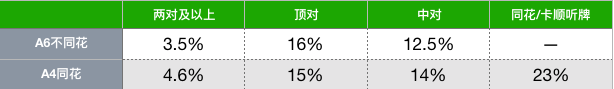 1. 击中两对及以上的情况——A6o在翻牌圈击中两对及以上牌型的概率为3.5%,而A4s则为4.6%,相较于A6o多了30%,这是由于A4s有直接击中同花和顺子的可能性。