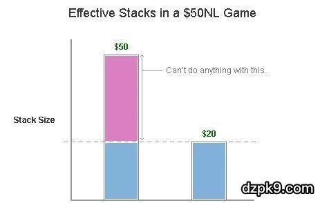 我们假设你在玩NL50。你的筹码量为$50,但在一手牌中,你唯一的对手只有$20。在这种情况下,有效筹码深度就是$20。你不能强迫对手向底池中投入多于$20的筹码,同样,对手也不能使你投入多于$20的筹码。