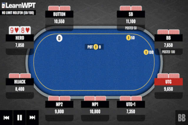 这手牌来自一个网络无限德州扑克锦标赛。盲注50/100。筹码量如下图。