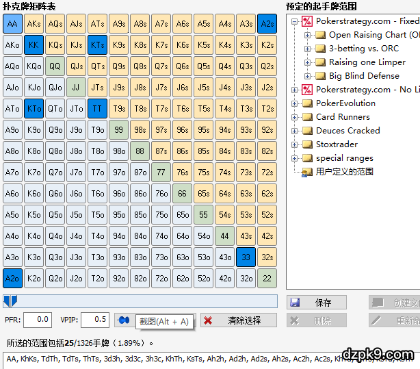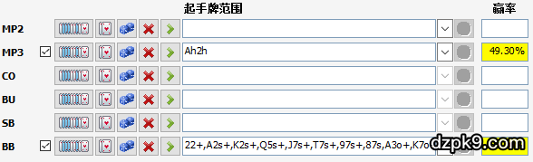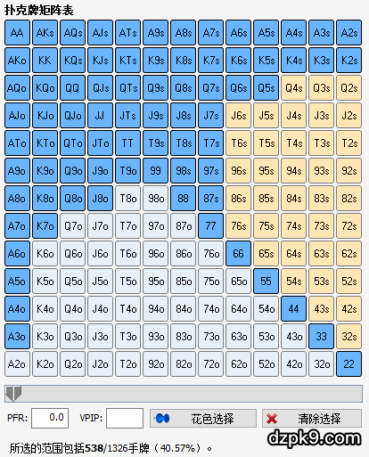 首先我们看下整体情况,两位玩家的后手筹码都是非常多的,其次由于Andy是在后位加注,庄位又只是平跟,两位玩家的整体范围会宽泛一些,所以大盲这时选择3bet是可以打走对方很多边缘牌范围同时保护自己AK,而Andy恰恰也知道Art会用大致40%较宽范围来加注,如下图所示: