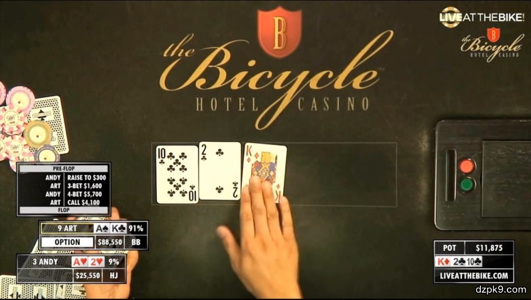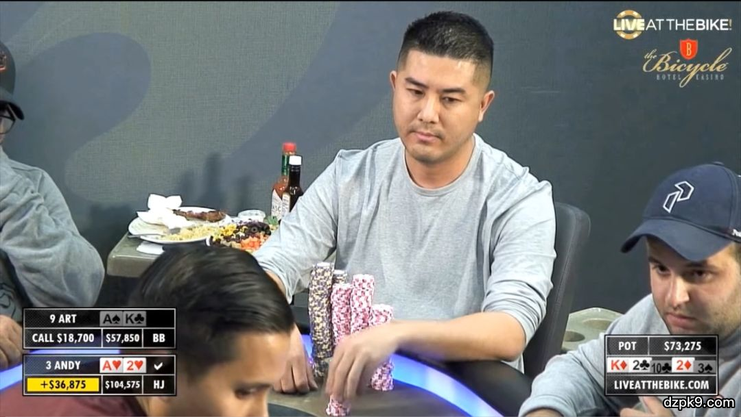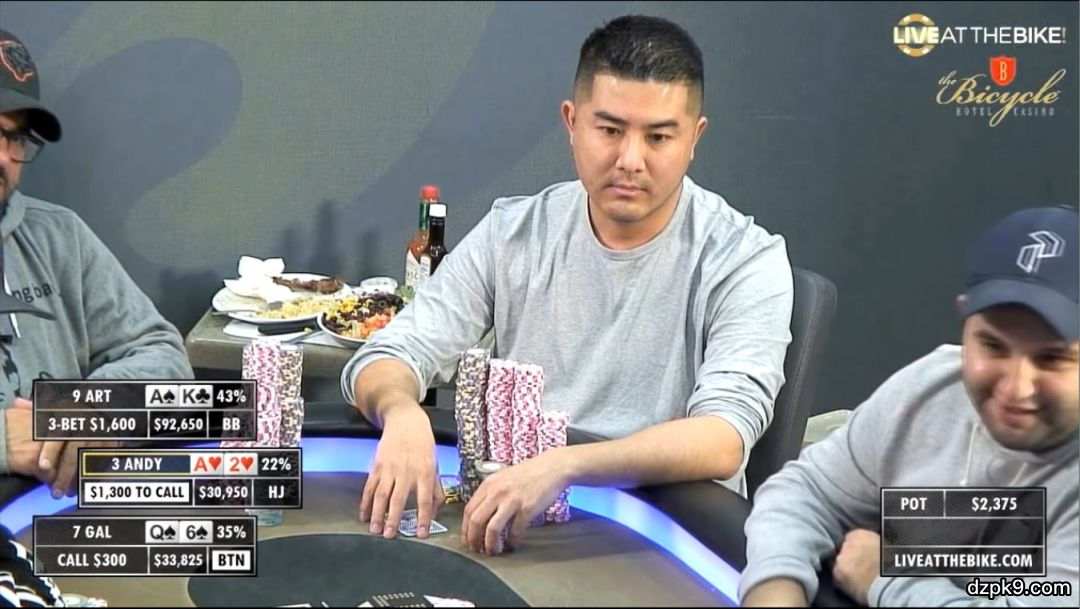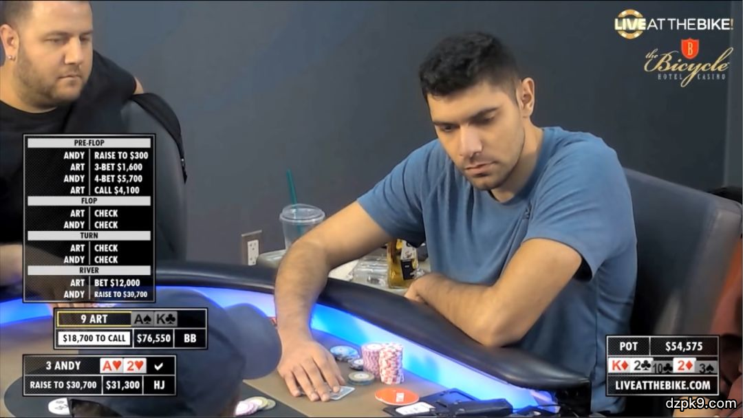 本次两位主角是3号位的Andy,筹码量为67700,以及9号位的Art,筹码量为94200。