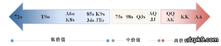 一般来说,在你有位置时,很难去确定哪些是高价值,哪些是中价值,哪些是低价值的牌,高价值的牌一目了然,中等价值的牌也很好区分,就是那些在flop还可以玩玩但不能去all in的牌,低价值的牌就是在flop不能去call一个下注的牌。