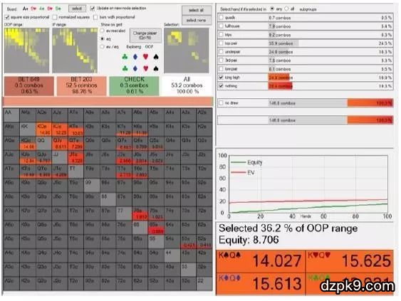 两极分化的范围,意思是要么是很强的价值牌,要么是bluff——没有中间地带。拿着中等牌力的牌做超池bet几乎没什么道理,是因为我们 bet 越大,对手通过我们这个过滤器的牌力就越强。而如果我们拿着超强牌时这么干就没问题,因为我们能击败对手的强牌。