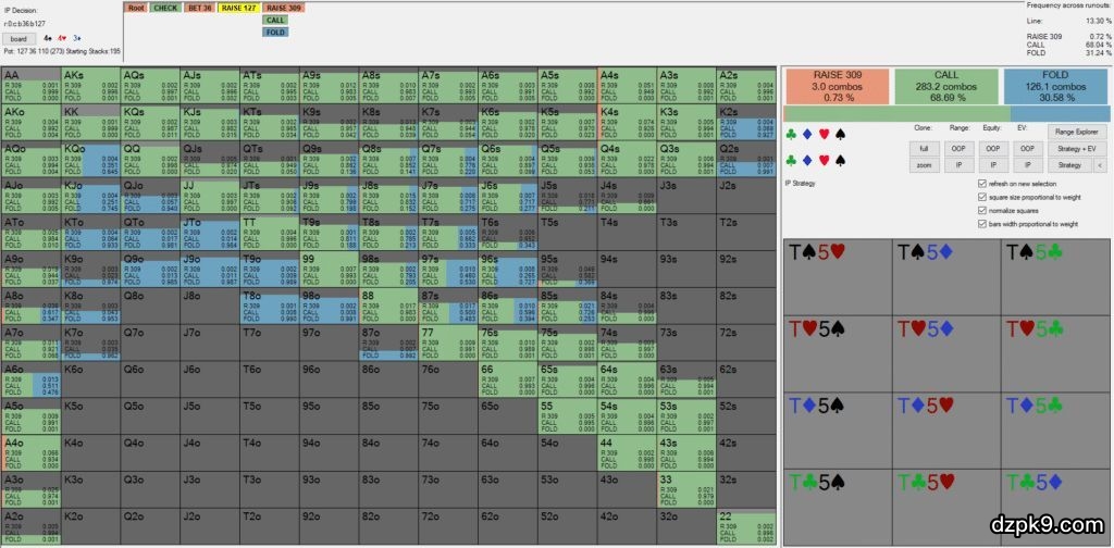 学会这5个过牌-加注策略,你的牌技将大大提升 834 A+ 学会这5个过牌-加注策略,你的牌技将大大提升在本文开始之前,先通过一手牌带我们进入今天的主题:线上$1/$2,6人桌,有效筹码量$200。前面三位玩家弃牌,按钮位加注到$5,小盲位弃牌,你在大盲位跟注。翻牌(底池6):4♠4♥3♦你过牌,按钮位c-bet$2,现在你该怎么打?很多时候,在这种没有位置优势的场合,你的策略会对胜率产生巨大的影响。以下将介绍5种过牌-加注策略,它们本质上都是相通的,为了便于大家更好地理解和运用,我们会将它们与上面的案例结合起来阐述。1在翻牌圈用更多诈唬牌而不是价值牌过牌-加注当你在翻牌圈过牌-加注时,你的诈唬牌组合应该约为价值牌组合的两倍。这个概念背后的数学原理需要花很多时间来解释,为了不让你感到厌烦,我们直接给出以下经验法则:当你在翻牌圈过牌-加注,力求为每手价值牌搭配两手诈唬牌。在文章开头4♠4♥3♦翻牌面的例子中,你应该用许多强价值牌组合(明三条或更好牌)为了价值而过牌-加注。在这个例子中你约有26种价值牌组合。良好的策略应该是当你拿着明三条时,80%的时候过牌-加注,然后在其余20%的时候为了增强你的过牌-加注范围而跟注。这样一来,当你在之后面临大额下注时可以更好地进行防守。因为约有21种价值牌组合,为了达到2:1的比率,你应该用42种诈唬牌组合诈唬。2用顺子听牌和同花听牌过牌-加注诈唬,如有必要再加上后门听牌你的过牌-加注诈唬范围应该由具有直接补牌的听牌,和能够在转牌圈潜在拿到强听牌的后门听牌组成。直接听牌(direct draw)很理想,但你在大多数翻牌面不会有足够多的直接听牌来平衡你的价值牌范围。当你感觉自己的诈唬范围太稀松时,你可以寻求用一些后门听牌过牌-加注。4♠4♥3♦就是一个直接听牌很少的翻牌面例子。以下是你在这个翻牌面可能拿到的直接听牌的列表:A5s(12种组合。注:s代表suited,指同样花色)65o和76o(24种组合。注:o代表off suit,指不同花色)75s和52s(8种组合)注意:之所以不包括A5s、A2s、65s和76s,是因为这些牌在本例中属于大盲玩家的3bet范围。你可以看到这里有44种两头顺听牌和卡顺听牌组合,已经超出了平衡你的价值牌范围需要的42种组合。所以,这就是你的诈唬范围吗?别这么早下结论。A高牌在这种场合因为具有太多摊牌价值而不能用来过牌-加注。为了弥补这些A高组合,你应该用一些后门顺子听牌和后门同花听牌,如8♦5♦,J♠5♠,9♥5♥来进行过牌-加注诈唬。3你的对手下注越小,你应该过牌-加注越多当你的对手下注较小时,他应该用一个比他下大注更宽(也更弱)的范围下注。你对抗较小下注的反应应该是扩展你的过牌-加注范围的价值牌部分,从而你可以在拿着强牌时让更多筹码卷入底池。当然,这也意味着你应该(以2:1的诈唬价值比)扩展你的诈唬范围。这种策略通过不让对手的中等牌和弱半诈唬牌以这样小的代价看到转牌和河牌惩罚了你的对手。你通过过牌-加注来设置他看牌的价格。哪些特定价值牌应该加入到你的过牌-加注范围中呢?像顶对顶大踢脚牌和顶对第二大踢脚牌这样的牌通常是你的最佳选择。有趣的是,如你接下来所见,Solver软件也用各种顶对来对抗较小下注。我们现在来看一个例子,看看改变对手的下注尺度会如何影响最优过牌-加注频率(根据PioSolver)。例子翻牌面是J♥8♠4♥。以下是PioSolver如何对抗一个标准尺度(2/3底池大小)下注:你可以在右上角的橙色矩形框看到过牌-加注频率。对抗一个2/3底池大小的下注,Solver软件在8.66%的时候过牌-加注。过牌-加注范围包括以很高频率加注的所有两对和暗三条,以及以较低频率加注的一些顶对。现在我们来看Solver在相同翻牌面如何对抗较小的下注(1/3底池大小):对抗一个1/3底池大小的较小下注,Solver软件的过牌-加注频率上升到12.65%,约为前种情况的1.5倍!现在AJ、KJ这样的顶对和诈唬牌都将以较高频率过牌-加注。4在小牌翻牌面为了保护用中等牌过牌-加注虽然你通常应该避免在采用激进玩法时缩紧你的范围,但在小牌翻牌面(例如9-3-2、7-3-3)你可以例外。为了保护在这些翻牌面用一些易受伤害的中等牌过牌-加注是有意义的。因为对手范围中有许多两张高牌类型的牌。尽管这些牌有不错的胜率,但它们在遇到你的加注时很大几率会弃牌,在4♠4♥3♦翻牌面,你范围中的高对(55-88)很容易受到转牌圈高牌的伤害。因此用55-88(甚至一些3x牌)过牌-加注是可行的。这种策略不是强制的,它不会为你赚到太多EV,但肯定是有益的。如果你真的选择用这些牌加注,你可以通过用一些后门听牌加注来平衡你的加注。5调整与剥削如果你对对手的类型或底池有任何特别的了解,为了增加你的EV你应该寻求调整你的策略。如果你认为对手将频繁弃牌,那么你应该扩展你诈唬范围,使之 包括更多听牌和后门听牌。如果你认为对手将频繁跟注,那么你应该缩紧你的诈唬范围,使之只包括强听牌(两端顺子听牌和同花听牌)。为了帮助你更好地找出那些弃牌太频繁的人,我们来看看按钮玩家在4♠4♥3♦面对过牌-加注的“GTO”回应:面对过牌-加注,Solver软件用许多高牌和后门同花听牌跟注,包括A9o、KQo、QTs、J9s甚至T8s。大多数你将遇到的牌手不会用这样宽的范围跟注,这意味着你将遇到的牌手弃牌太频繁。对抗这类牌手你可以在翻牌圈大幅提高你的诈唬频率。 德