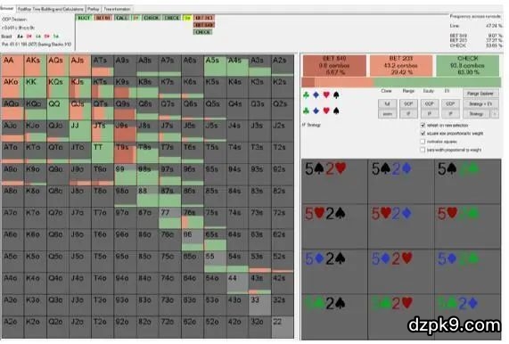 随着你更擅长在不利位置游戏边缘摊牌价值牌,你可能想用更多边界牌check,而不是用所有这些牌诈唬。如果正确执行这种策略,这应该使你多赚到一点EV,同时降低你的诈唬频率(使你的剥削性策略更难发觉和针对)。