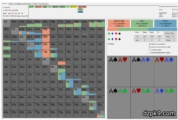 首先我们计算Pio中的最优均衡。以下是按钮玩家对抗我们最优2/3底池下注范围的最优河牌圈跟注范围: