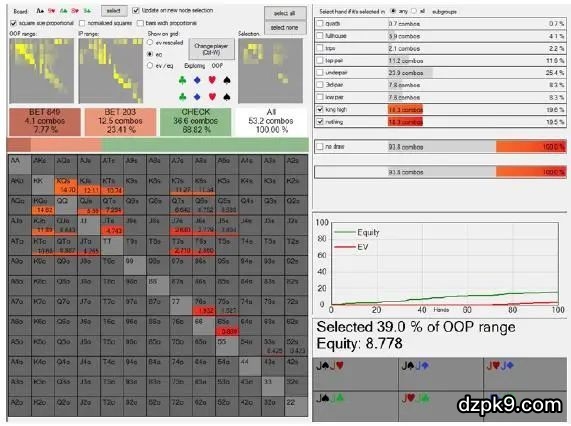 我们看看理想情况下我们用多少空气牌(K高及更差牌)下注。范围探索者表明,我们用69%的空气牌check,而用剩余空气牌诈唬: