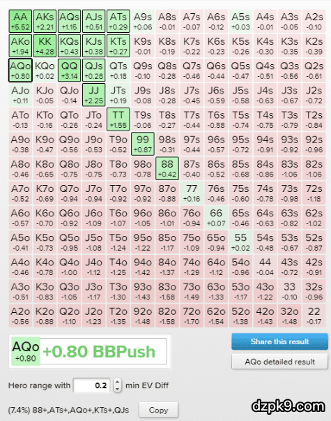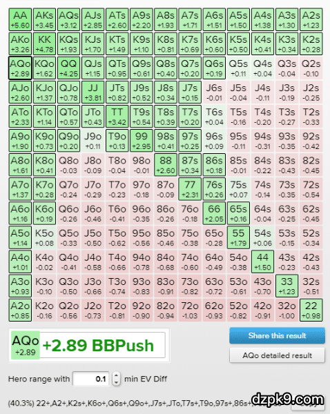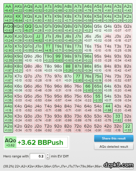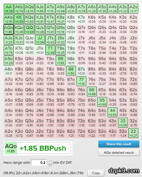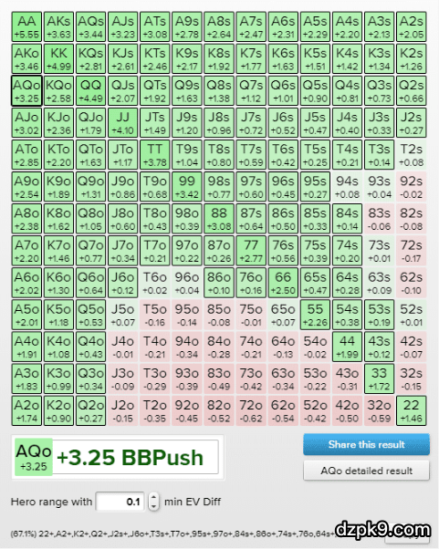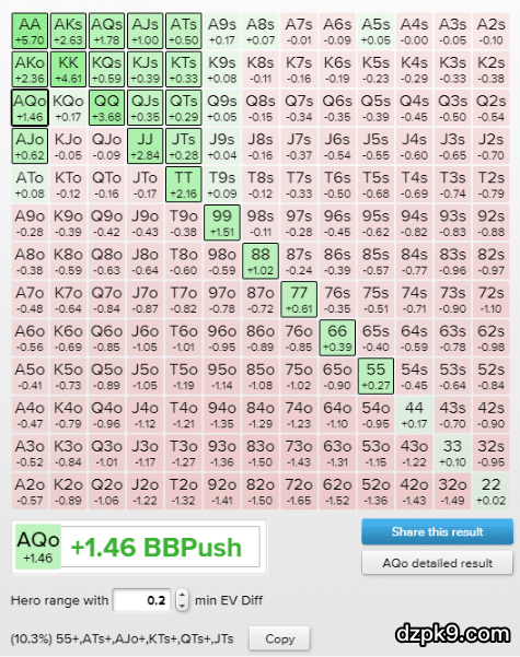 用于生成这些范围的程序(ICMIZER)衡量每手牌用来全压在筹码上的期望值(简称筹码EV或cEV)。筹码EV是用大盲注(BB)来衡量的。