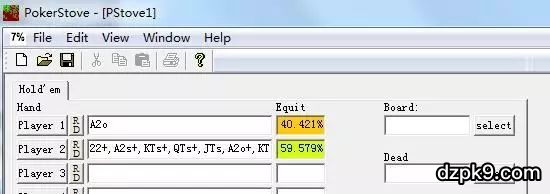 你可以查询你的牌对抗一个范围的状况。假设你还是拿着A2o,并认为对手的范围是22+、Ax和任何大高张(两张10以上的单牌)。你对抗这个范围有大约40%的胜率: