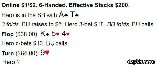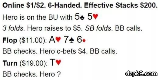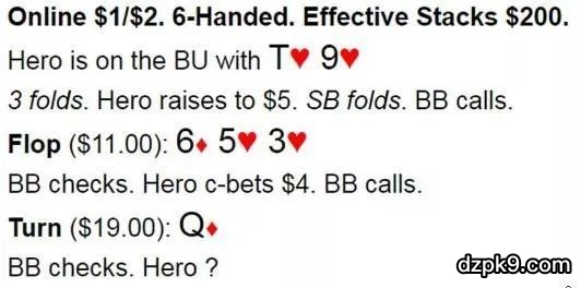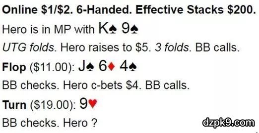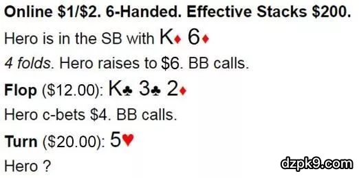 你即将“游戏”的10手牌已经打到转牌圈,而且你已经在翻牌圈持续下注。每手牌你有两个简单的选择:下注或check。答对六题即算合格。