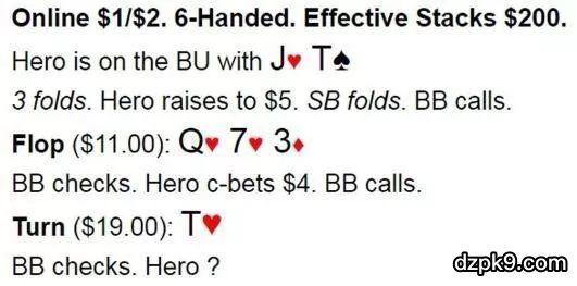2.我们再次在转牌圈得到摊牌价值。在这个转牌面下注将使我们和对手的好牌隔离在一起。此外,下注将迫使对手放弃许多本会在河牌圈寻求诈唬的牌。