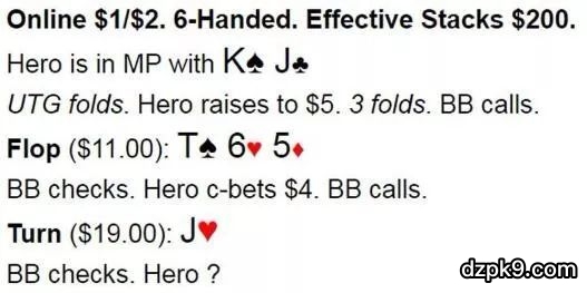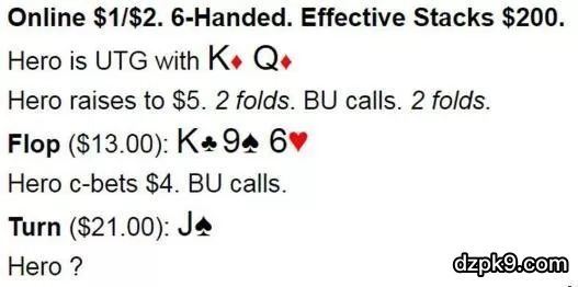 1.现在我们在转牌圈得到了摊牌价值,应该check。如果我们下注而对手跟注,他的范围将主要由更好牌构成。此外,check给了对手在河牌圈诈唬的机会,而下注拒绝了那个机会。