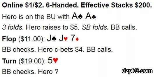 5.我们的牌可以舒服地为了价值下注一条街。那么,我们在转牌圈是下注还是随后check并寻求一个河牌圈下注呢?在本例中,答案随后check,从而我们能够在河牌圈抓诈唬或做延迟持续下注。与更小的高对不同,拿着AA时河牌圈不可能发出任何高牌,因此我们可以舒服地随后check,允许对手看一张免费牌。此外,拿着两张A使得对手极不可能拿着A高,这意味着他更可能有一手将在河牌圈下注的牌(比如破灭的卡顺听牌或中等价值牌)。