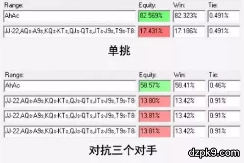 这是一个你应该首先仔细思考接下来会发生什么的场合。一旦你在翻前得到两个、三个或四个跟注,你应该不再对自己的牌感到兴奋。因为有多个跟注,AA的胜率显著降低。我们来看看AA在单挑场合和多人底池场合的胜率情况: