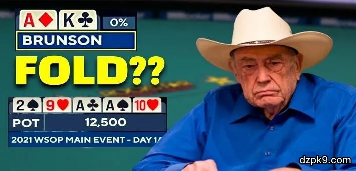 今天的牌局,我们将分析在2021年WSOP主赛事上,拿到三条A的“扑克教父”Doyle Brunson,在面对对手加注时进行的一个不可思议的弃牌。这手牌发生在10,000美元的WSOP主赛事Day 1A的第4个游戏级别,由扑克传奇人物Doyle Brunson对阵Chau Nguyen。游戏级别:300/500,前注500。Doyle Brunson的筹码比对手稍微多一些。Chau Nguyen用T♠T♣(T代表10)在UTG+1位平跟溜入(limp),Doyle Brunson拿着A♦K♣在CO位直接跟注。小盲位的Eliran Yamin用4♣2♣也跟注,David Lolis则用Q♣3♣在大盲位过牌。彩池大小:2,500。这是一个干燥的翻牌面。击中底对、听后门同花和顺子的Yamin下注1,000。Lolis很快就弃牌了,Nguyen跟注,击中顶对顶踢脚的Doyle Brunson跟注。彩池大小:5,500。Brunson击中了三条。Yamin在翻牌得到两个跟注后选择了过牌,Nguyen在后面也过牌。当行动来到Brunson面前时,他打了3,500,2/3个底池。Yami没有过多思考就弃牌了,Nguyen用两对进行跟注。彩池大小:12,500。Nguyen在桌面轻轻的敲了两下示意过牌,Brunson打了接近一个底池,Nguyen随即过牌-加注到30,000。面对这个加注,Brunson陷入了思考。在经过了慎重的考虑之后,Brunson弃掉了手上的三条A加顶跟张,Nguyen拿下这个54,500的底池。