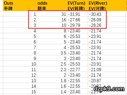 这很好理解。因为到转牌时,我们能多看一张公牌,也就是说,未知牌少了一张,也就是说,EV的算式会有一点改变: