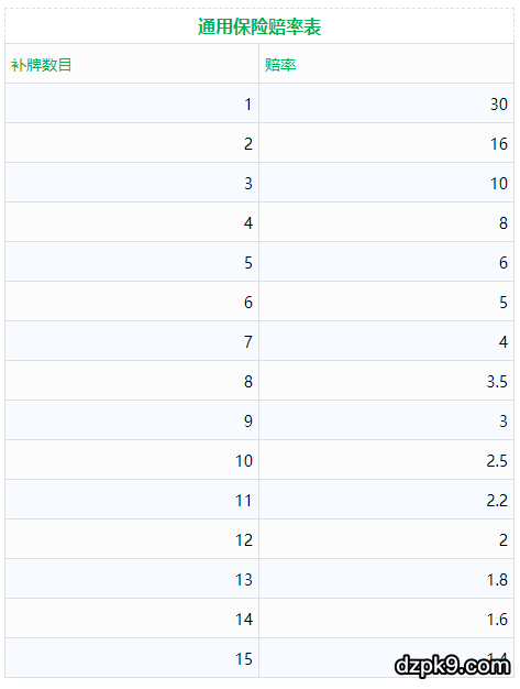 从表上我们能看到,保险的赔率是跟补牌挂钩的。补牌的数目越多,对手中牌的机会就越高,赔率就越低。