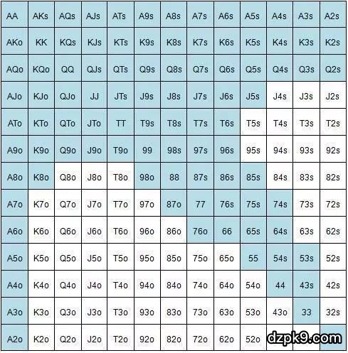 现在我们来讨论——当你在按钮位置,前面玩家都弃牌,你该如何游戏——因为这是德州扑克中的最重要场合之一。以下是我的按钮位置率先加注范围: