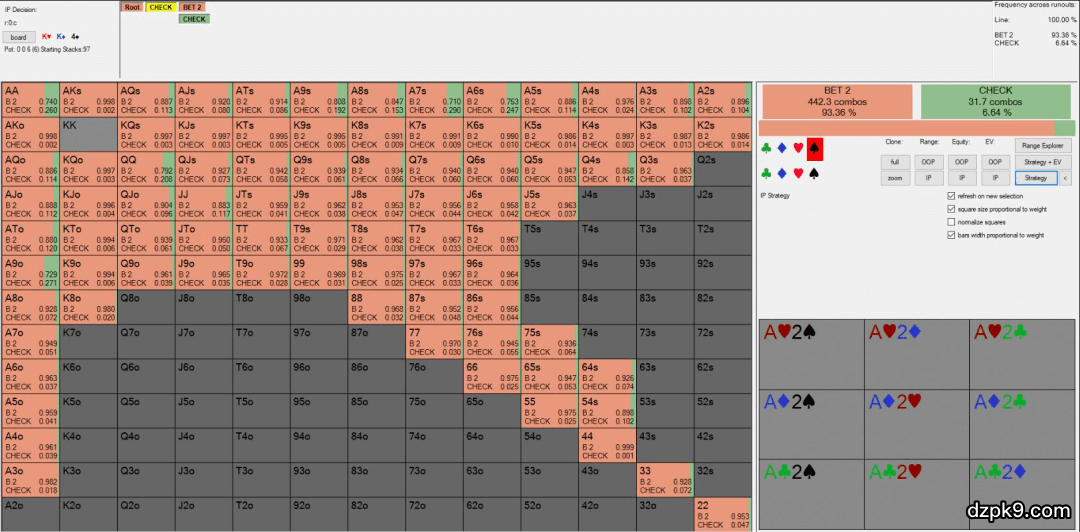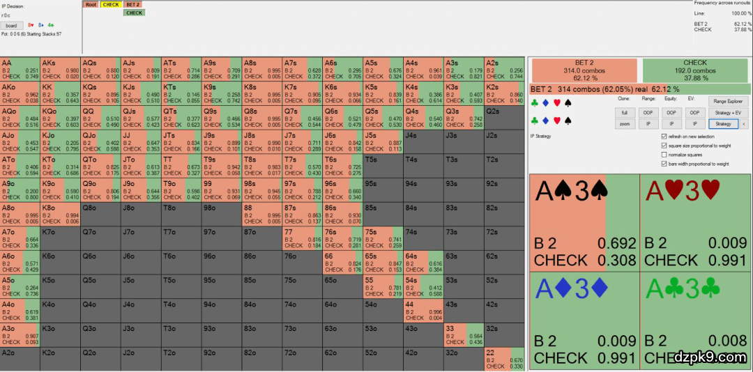如果你认为对手check-raise不够激进,这是一种良好的游戏方式。注意:你实际上是用这个尺度利用他们较低的check-raise频率。以下是这种策略参照的PioSolver解决方案: