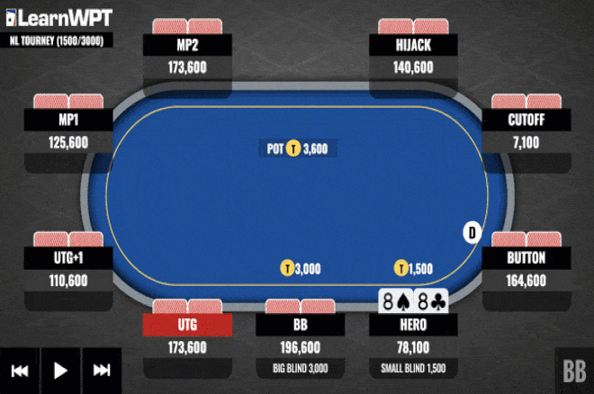 这手牌来自一场无限德州扑克锦标赛。桌上玩家筹码量如图。此时盲注1500/3000,前注75。翻前,前面玩家陆续弃牌,CO玩家全压7100筹码,按钮玩家弃牌。你在小盲位置拿着8♠ 8♣。你会如何行动?