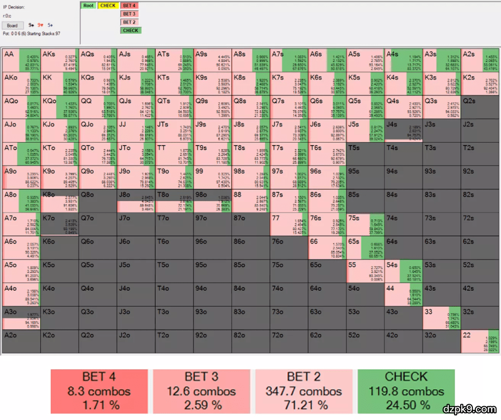 以下是PioSolver对于9♠ 9♥ 5♦翻牌面的解决方案: