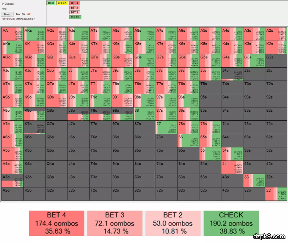同样,我想选择一个和前一翻牌面类似的翻牌面:Q♠ 9♠ 4♥。以下是PioSolver软件的模拟: