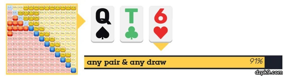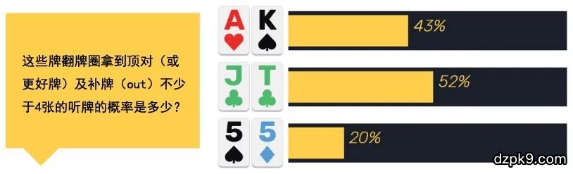 持续下注诈唬是牌手们学习翻后策略时最先学到的一个概念。许多扑克书常常建议我们“翻前加注,如果你得到一个跟注,你通常应该在翻牌圈做一个持续下注”。扑克学习者们读到这样的陈述后推断这意味着“100%持续下注”。而随着时间推进,这种做法的问题逐渐明朗。因为你的持续下注范围中大部分牌都是诈唬牌(范围从卡顺听牌到纯粹的高牌)。简而言之,如果你持续下注太少,你最终会错过许多绝对有利可图的诈唬。如果你持续下注过频,特别是在错误的场合,你将在许多不必要的场合损失更多。坦率地说,这些你持续下注太频繁并损失一些EV的场合往往被你忽略。牌手会注意到他们输掉大底池或连续二次诈唬失败,但丝毫不会注意他无效的4bb持续下注。但这种4bb、5bb、6bb的持续下注累加起来,你将发现只因为“我应该经常在翻牌圈持续下注”引发的大量漏洞。所以,今天我们将从以下问题的角度讨论如何处理持续下注:“我知道我应该在我是翻前进攻者时持续下注。但对手总是跟注我,我不得不在转牌圈一直check-fold。我应该怎么做?”这是一个极常见的扑克问题。牌手认为他作为翻前加注者应该几乎总是持续下注。但最终那种策略无效,你的对手对每个持续下注都不弃牌。现在怎么办?在你考虑减少持续下注或改变你的持续下注尺度之前,首先思考翻牌圈持续下注有多好。如果你完全不考虑公共牌结构、对手的范围和可能的持续下注范围等因素,在翻牌圈不假思考地下注,你是在烧钱。当然,有时你会挑场合,但你发现自己随着这种游戏的不断成熟而输掉更多底池。持续下注的定义往往被人误解,但其实持续下注并不天生说明你的牌是强是弱。翻牌圈持续下注是来自翻前进攻者的一个翻牌圈下注。你是拿着坚果牌、纯空气牌还是其他牌并不重要。当你在翻牌圈或其他回合持续下注时,你应该确保你的对手会(或早或晚)足够频繁地弃牌。许多牌手不假思考地下注,并希望对手的弃牌频率使他此刻的下注完全有利可图。由于通常的持续下注尺度是1/2底池、2/3底池,他们需要对手在33%和40%的时候弃牌。你的对手会那么频繁地弃牌吗?假设你认为对手翻前用约20%起手牌跟注你的翻前加注。这包括中小口袋对子、非同花大高张、同花连子、同花隔点连子(suited gapper)、同花Ax牌。如果翻牌是Q♠T♣6♥,若你下注2/3底池,他会足够频繁地弃牌吗?如果你认为对手将用所有对子、听牌和一些后门听牌/弱听牌继续游戏,对手的弃牌频率肯定不会使这个持续下注诈唬有利可图。因此,如果你不打算再次下注,你是给他送钱。你需要读牌技能去给对手的翻前行动指定一个范围。然后你拿那个范围和翻牌比较。仔细考虑他总是/经常/从不跟注你持续下注的牌型。有些牌手对抗持续下注将用任何对子和所有可能的听牌继续游戏,因此弃牌率相当低。另一些牌手则用中对或更好牌以及两端顺子听牌、同花听牌继续游戏。这种牌手弃牌频繁,因此在翻牌圈对他们诈唬非常合理。最后要注意的是,你的翻前范围是否太宽。大多数牌会错过翻牌。即使AK也只在约1/3的时候拿到顶对或更好牌。但如果你总是错过翻牌,特别是对抗很少对单单一个持续下注弃牌的牌手,你可能应该重新检查一下你翻前用来攻击的底牌范围。如果你不确定是否花时间研究这些东西。谨记,这类探索是有好处的,因为不管在现场扑克还是网络扑克它都能派上用场。当牌手机械的持续下注开始失效时,他往往有三种选择:1. 从不调整。总是自动下注,总是被跟注,总是在转牌圈或河牌圈弃牌。2. 较少翻牌圈持续下注(通常是通过移除一些诈唬牌)。3. 翻牌圈持续下注,但更频繁地二次下注和三次下注。显然,第一种选择很糟糕。在你阅读本文之前很可能已经知道,因此我不会浪费时间讨论它有多糟。第二种选择可能是正确的。这往往是我对抗弃牌不够多的比较鱼对手时的一种常见调整方式。对抗这类牌手,为利用他们的漏洞我缩紧自己的持续下注范围。他们用太宽的范围跟注,因此我做较薄的价值下注。对他们诈唬很困难,而且我对抗不需要平衡自己的范围。第三种选择是你应该主要关注的。只因为一个下注未达成任务并不意味着你完全放弃下注。相反,考虑对手将多频繁地对你的持续下注弃牌,然后问自己如下问题:“在这些跟注我翻牌圈持续下注的牌中,有多少牌能够承受二次下注?”注意,把关注的焦点从“我的牌是什么?”转移到“对手的范围是什么和它如何处理压力?”上。这对于新手是一个巨大的心态转变,虽然有些复杂,但却是制定+EV诈唬决策的基础。我们沿用之前的例子。你在翻牌圈下注,对手将用对子、听牌和一些后门听牌跟注。当转牌是5♣时,对手的范围面对二次下注会多频繁地跟注?这需要一些读牌和估算,但花费一点儿努力,得出答案是完全可能的。那个翻牌圈继续游戏范围在转牌圈约在40%的时候有顶对及更好牌和良好的听牌。如果你认为你可以用二次下注迫使其他牌弃牌,做任何稍小于底池大小的下注是有利可图的。这种情况远多于普通牌手的想象,且只需要一些局后练习就能轻松找出。在练习时使用Flopzilla或Flop Falcon软件可以帮助你理解这些局面。谨记,只因为牌手不在翻牌圈频繁弃牌并不意味着我们应该害怕在翻牌圈诈唬。你需要提前思考,考虑对手能够多频繁地承受转牌圈和河
